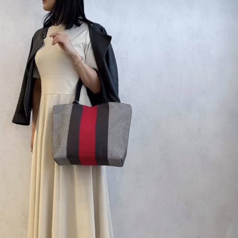 ストライプの赤が挿し色になってカジュアル過ぎず、オシャレに見せてくれます。中のポケットもあるので整理しやすく、持ち手もしっかりしているので肩にもかけやすいです。長く愛用出来そうです。ありがとうございました。 (2022/09/13 12:36)