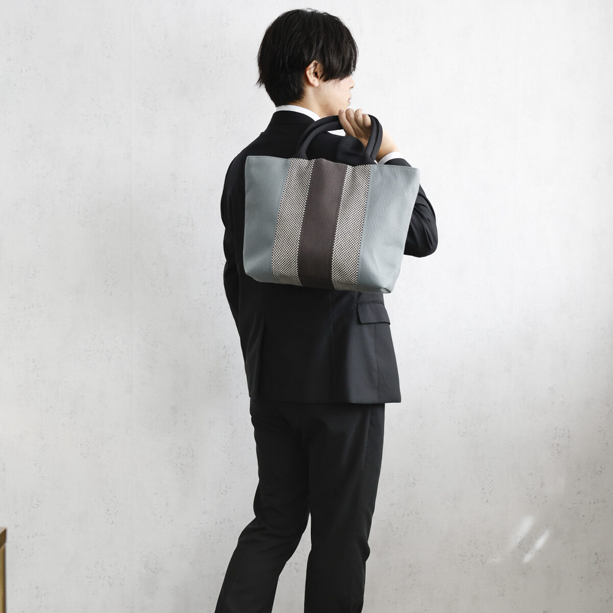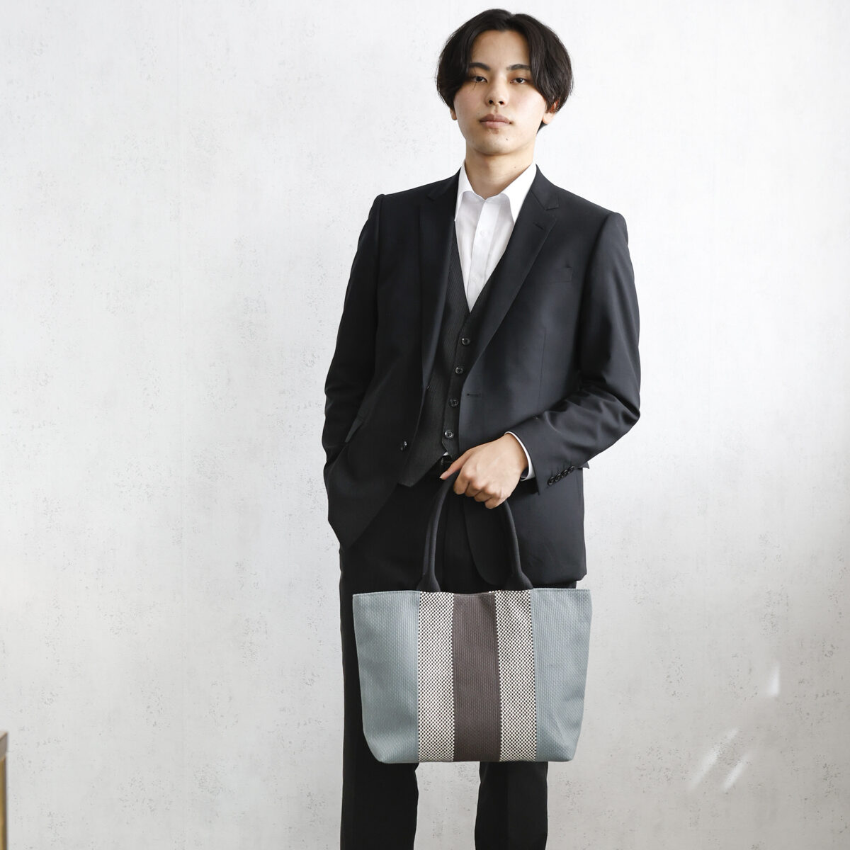 刺し子織のストライプ配色が美しいトートバッグ。トリコロールのバーチカルラインが上品さと個性を、ファッションにプラス。コーディネートのポイントにもなるストライプデザインはタネイの職人の技が詰まった逸品です。A4サイズがしっかり入る容量で、中にはオープンポケットとファスナー付ポケットが付き、小物もしっかり整理して収納可能。